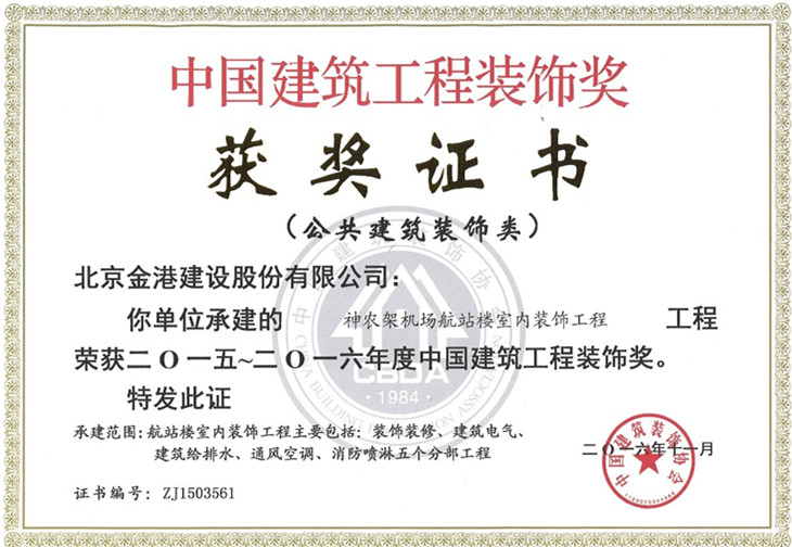 2016年12月23日,2015-2016年度中國(guó)建筑工程裝飾獎(jiǎng)?lì)C獎(jiǎng)大會(huì)在北京國(guó)家會(huì)議中心隆重舉行,我公司承建的神農(nóng)架機(jī)場(chǎng)航站樓室內(nèi)裝飾工程以及雙井宿舍樓裝修工程憑借卓越的設(shè)計(jì)和精良的施工質(zhì)量榮獲2015-2016年度中國(guó)建筑工程裝飾獎(jiǎng)。