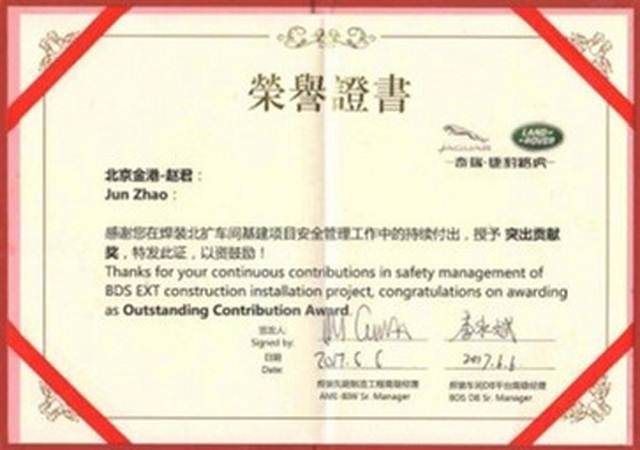 儀式最后,為表彰個(gè)人在施工過程中的突出貢獻(xiàn),業(yè)主給我司員工苑寧和趙君分別頒發(fā)了 “杰出貢獻(xiàn)獎(jiǎng)”和“突出貢獻(xiàn)獎(jiǎng)”的榮譽(yù)證書。